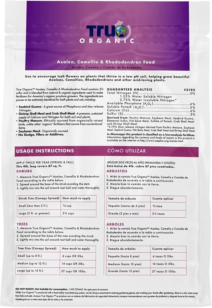 - Enhances Flowering for Acid-Loving Plants: True Organic Azalea, Camellia & Rhododendron Food promotes lush blooms on plants that thrive in low-pH soil.