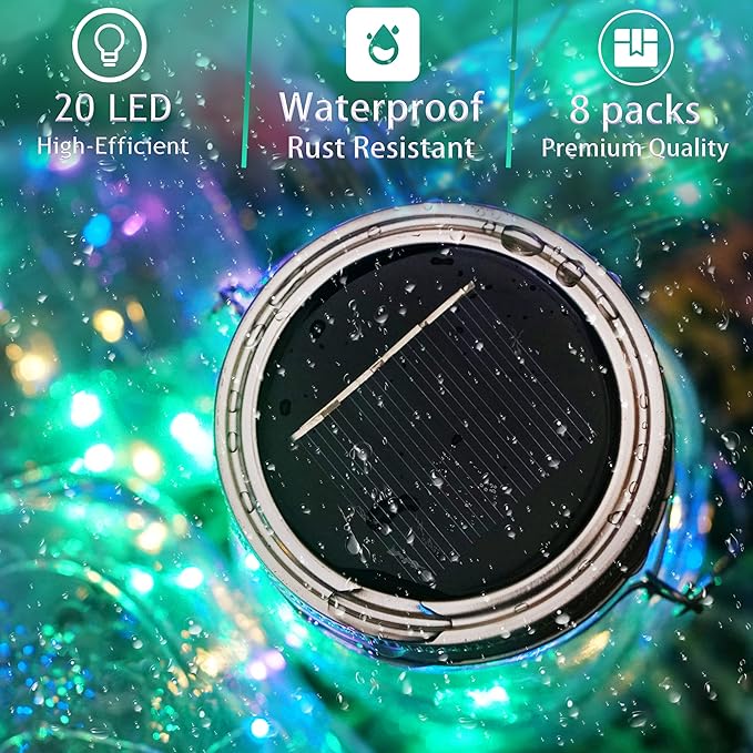 - 🎁UPDATED MASON JAR LID LIGHTS - Colorful Lights, with 20 micro LED, much brighter than those 10 LED jar lights. Larger solar panel, charge more efficiently. The edge of the lid uses rustproof material instead of cheap alloy, you would find it more durable in humid weather.