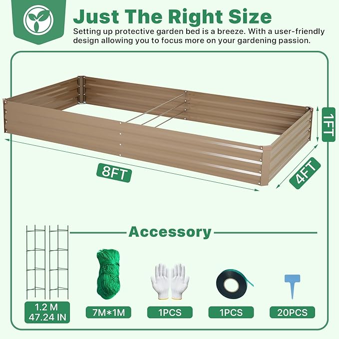 ONCEMORE Galvanized Raised Garden Bed for Vegetables Flowers Herbs, Metal Raised Garden Bed Kit with 2 PCS Tomato Cage, Gloves, Trellis Netting, Plant Labels, Plant Ties, Brown 8×4×1FT