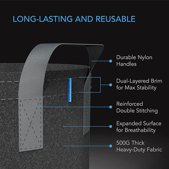 AC Infinity Heavy Duty Fabric Pots, 3 Gallon Aeration Reusable Grow Bags 5-Pack with 500G Thick Nonwoven Fabric and Multi-Purpose Rings, for Low Stress Plant Training Fruits, Vegetables, and Flowers