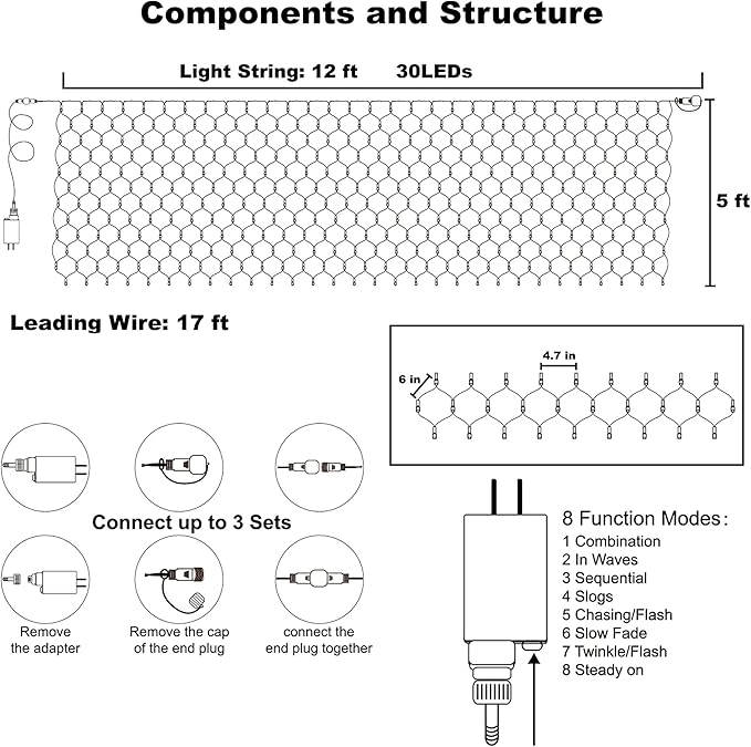 - 8 Lighting Functions: Our Halloween mesh string lights have 8 lighting modes: combination, in waves, sequential, slogs, chasing/flash, slow fade, twinkle/flash, and steady on. Fit different occasions, moods, feelings, holidays, festivals, anniversaries, etc. Pressing the round button on the transformer to change the lighting modes.