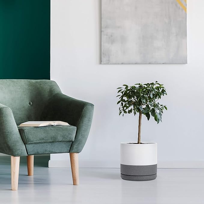 D'vine Dev Set of 2 Plants Pots, 10 Inch Ceramic Planter Pot for Plants with Drainage Hole and Saucer, White/Speckled Grey, 94-V-E-6