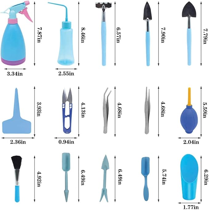 - For 19 Pieces Succulent Plants Tools:Material: Plastic + Metal.1 x Scissors,1 x Cleaning brush,1 x Straight head Tweezers,1 x Elbow Tweezers,1 x Air dust blower,1 x Shovel,1 x Spade,1 x Rake,1 x Spray Watering Bottle,1 x Pail Shovel,1 x Watering bottle,5 x T-type Garden Label Plant Markers,1 x Seedling lifter,1 x Punch,1 x Scoop shovel.