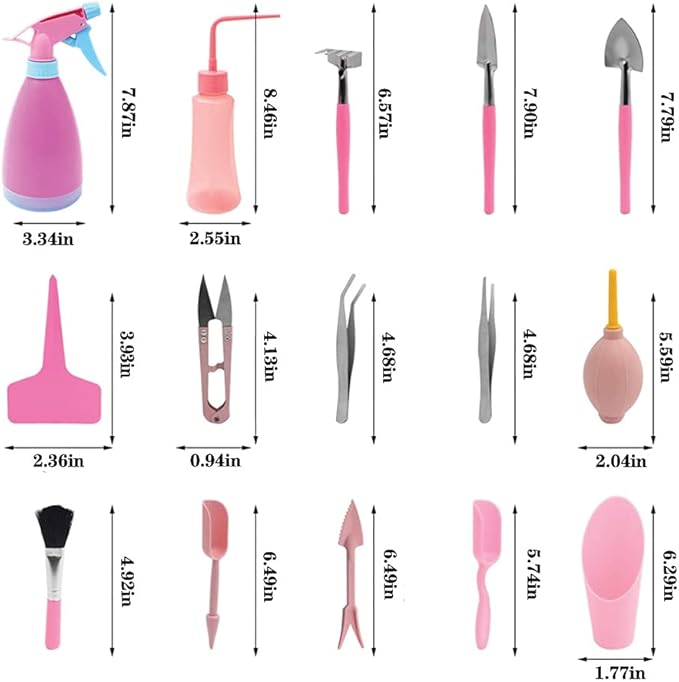 - 🎀 For 19 Pieces Succulent Plants Tools:Material: Plastic + Metal.1 x Scissors,1 x Cleaning brush,1 x Straight head Tweezers,1 x Elbow Tweezers,1 x Air dust blower,1 x Shovel,1 x Spade,1 x Rake,1 x Spray Watering Bottle,1 x Pail Shovel,1 x Watering bottle,5 x T-type Garden Label Plant Markers,1 x Seedling lifter,1 x Punch,1 x Scoop shovel.