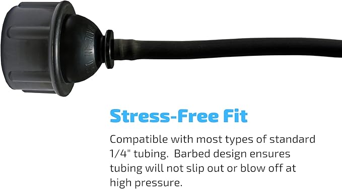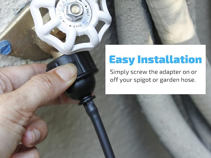 - Simple Installation: This adapter fastens easily and quickly onto any standard spigot or garden hose after attaching the 1/4" tubing.