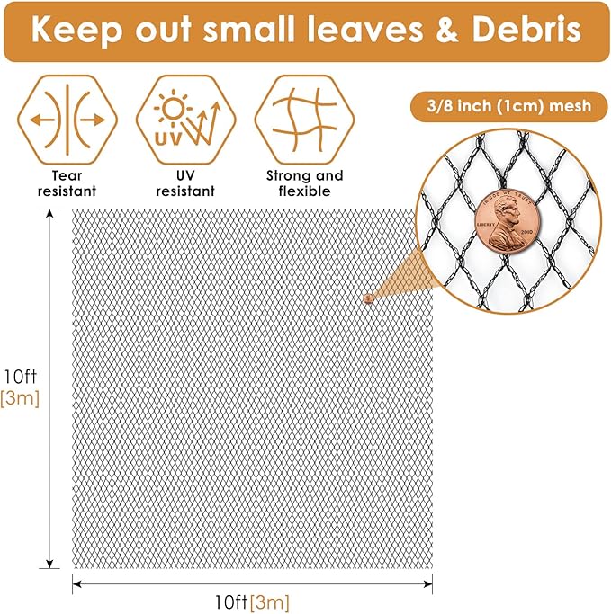 - ๐ฅ๐ฒ๐น๐ถ๐ฎ๐ฏ๐น๐ฒ ๐๐ถ๐๐ต ๐ฃ๐ผ๐ป๐ฑ ๐ฃ๐ฟ๐ผ๐๐ฒ๐ฐ๐๐ถ๐ผ๐ป - 3/8 inch SMALL mesh size leaves pond netting can be effective prevents the leaves,branches and debris from falling into the ponds and keep the water be clear and healthy. Also protect your goldfish and koi fishes against birds, cats, and other predators.