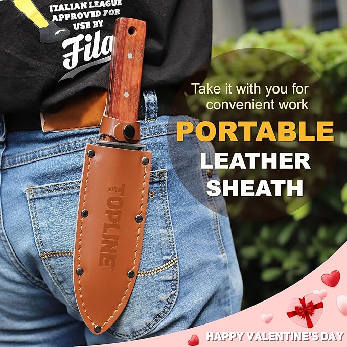Topline Hori Hori Garden Knife, Double-edge Stainless Steel Blade, Garden Knife with Leather Sheath for Digging, Weeding, Planting, Hori Hori Knife with Sharpener, Sharpening Stone Included