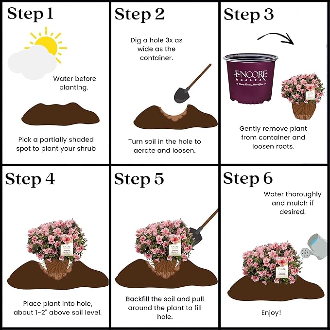 - Product Care Instructions : • Water before planting • Plant in full sun to part shade • Dig hole 3X the width of pot • Backfill and plant 1″-2″ above soil level • Water and add more soil if needed • Mulch plants • Water before planting • Plant in full sun to part shade • Dig hole 3X the width of pot • Backfill and plant 1″-2″ above soil level • Water and add more soil if needed • Mulch plants