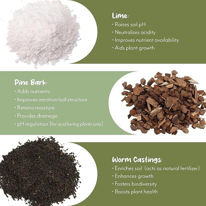 - Ingredients: Peat moss, pine bark, pumice pieces, worm castings, horticultural perlite, lime