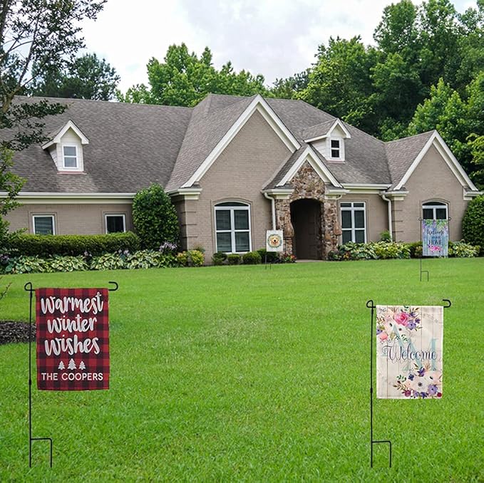 - PREMIUM QUALITY AND 10 PACK- Professionally designed, the high-quality black matte wrought-iron garden flag stands feature welded joints to improve its strength and durability while also being weather resistant.Our garden flag holder stand set has 10 flag poles, which can meet the requirements of your big yard ,garden, or your lawn or anywhere. You can also give it to friends as a housewarming/holiday gift. It is really competitive pricing and quality product.