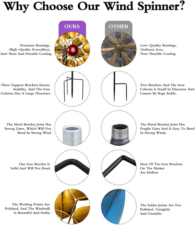 - Edge Blunting: Protect your hands when installing and using kinetic wind spinner, not easy to get hurt. Provide easy-understand installation instructions, you can finish assembling in minutes
