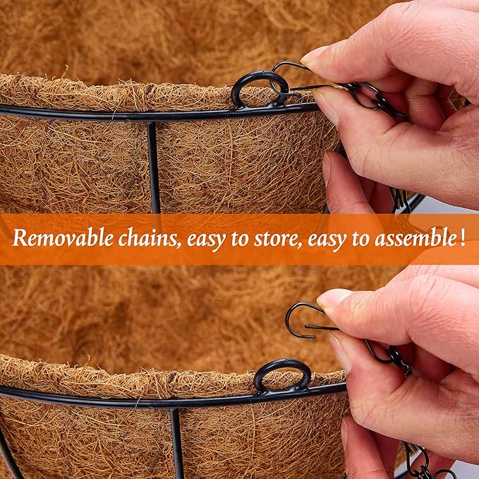 - Natural & Durable Material: For our metal hanging flower basket with pot liners for plants, the coco liners for planters are made of 100% natural coconut fibers which has good air permeability and water retention; the frame and hanging basket chain are made of iron with powder-coated to prevent rust, which is strong and durable. So you can rest assured to use them outdoors