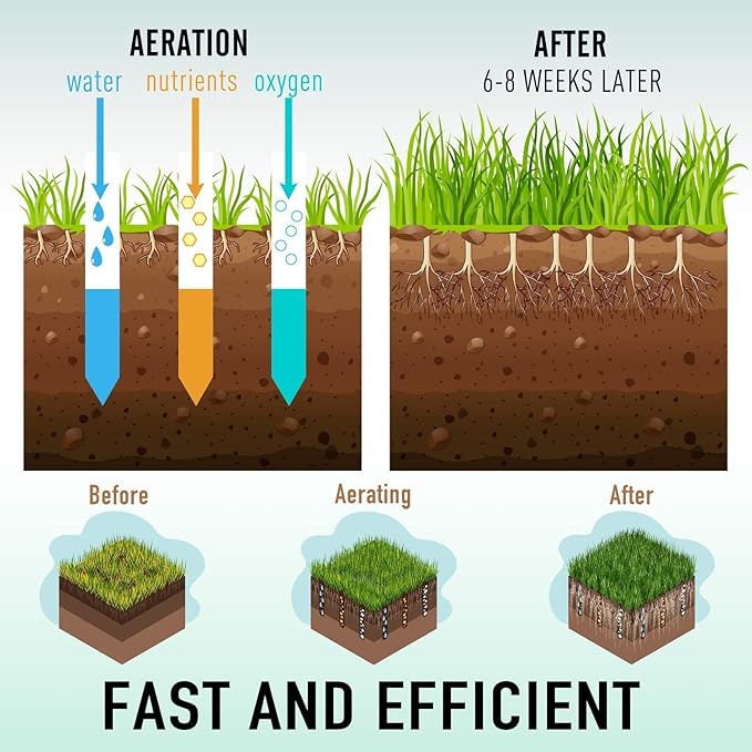 - WHY YOU NEED THIS SPIKE LAWN AERATOR -- grass roots need air, water and nutrients to grow thick, deep and strong. When soil becomes compacted, even slightly, it inhibit the flow of the essentials that support thicker, healthier turf growth. Aeration creates holes down into the soil to alleviate compaction so air, water and nutrients can reach grass roots.