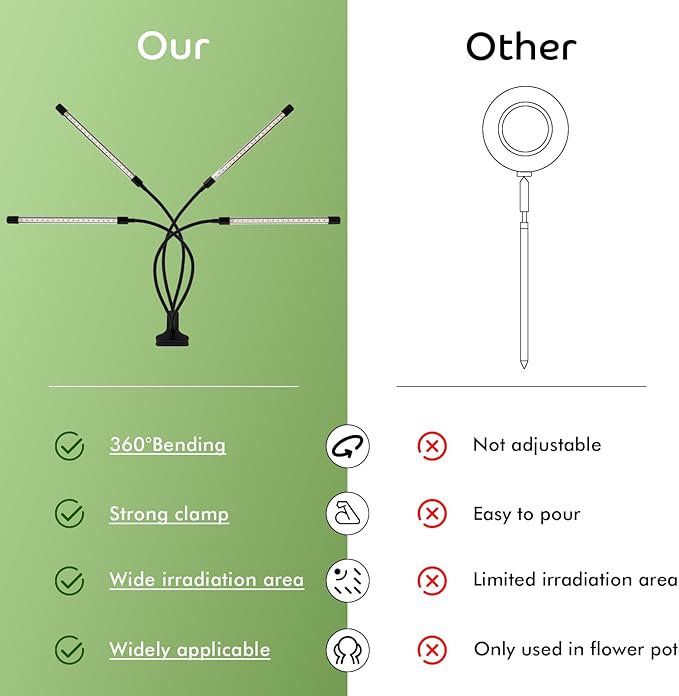 - Flexible gooseneck & sturdy clamp: Our growing lights for indoor plants with 360° Gooseneck and clip require less room space, you can clip it to a shelf or a desk and adjust the lights to any angle and distance