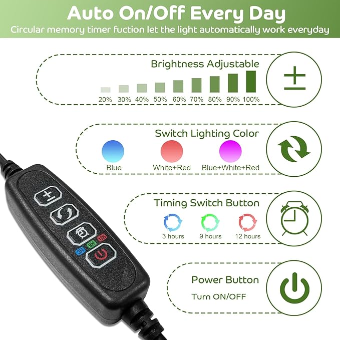 - Circular memory timing function: Our plant lights for indoor growing can automatically turn on / off for 3/9/12H every day based on your settings