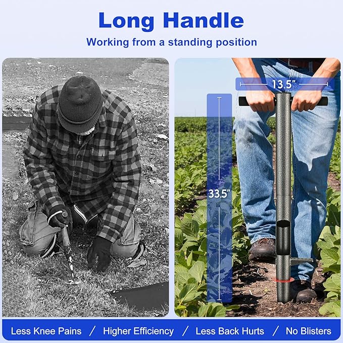 - NO PAIN & NO BREAKING: With an ergonomic height of 33.5” and foam padded handle, you can work from a standing position without body hurts, back knee pains or blisters. Rust free power coated steel construction makes this bulb planter tool stands up to millions of bulbs’ planting and not breaking. NOTE: Each bulb planter enjoys 12-month warranty, replacement or refund will be arranged once we receive your message.