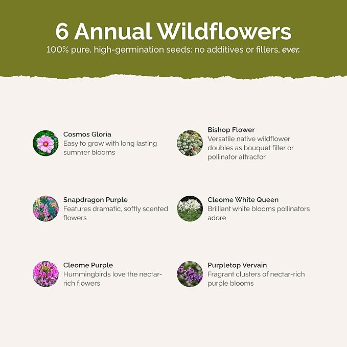 - 100% Pure, Non-GMO Seeds - No fillers, favorites only! Includes 6 easy-to-grow species: Cosmos Gloria, Bishop's Flower, Snapdragon Purple, Cleome White Queen, Cleome Purple, Purpletop Vervain