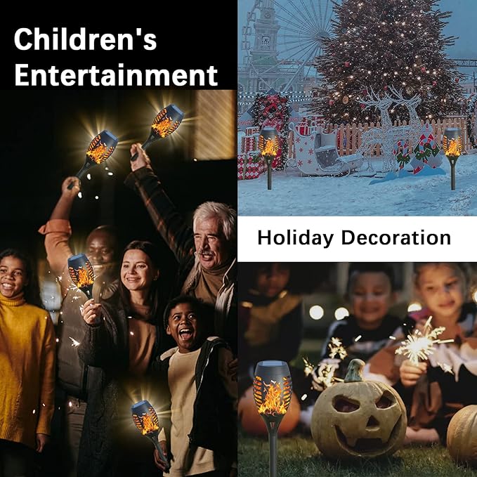 - 🔥【Auto Charge & Auto Light Up】: Solar tiki torches for outside automatically collect solar energy all day in direct sunlight and turn it into electricity to continuously charge the battery and include a photosensitive control switch on its solar panel, From dusk to dawn (no sunlight), the lights are automatically turned on, and when the sun rises (the solar panel receives sunlight) the lights will automatically turn off and charge automatically. Convenient and practical.