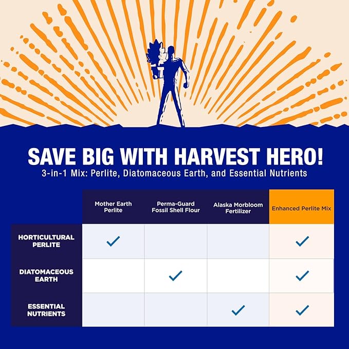 - SAVE MONEY WITH HARVEST HERO: Our 3-in-1 mix of diatomaceous earth, perlite, and essential nutrients will save you money. No need to purchase multiple products separately and spend a fortune. Our carefully tested and optimized mix eliminates the guesswork. We’ve fine-tuned the efficient ratio to ensure superior performance, saving you time, money, and effort. Experience the convenience and value of a ready-to-use mix that supports robust plant growth while keeping your budget in check.