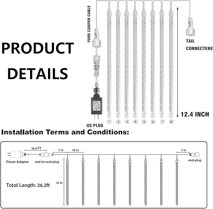- Dimensions: The outdoor Christmas lights has 8 tubes, each tube size is 30 cm / 12 inches, the wire between tubes is 40 cm / 15.7 inch, each tube is individual of others, leading cord is 2.1 m / 6.9 ft. Each tube has 36 LED lights, is more bright than other 24 LED meteor shower lights.