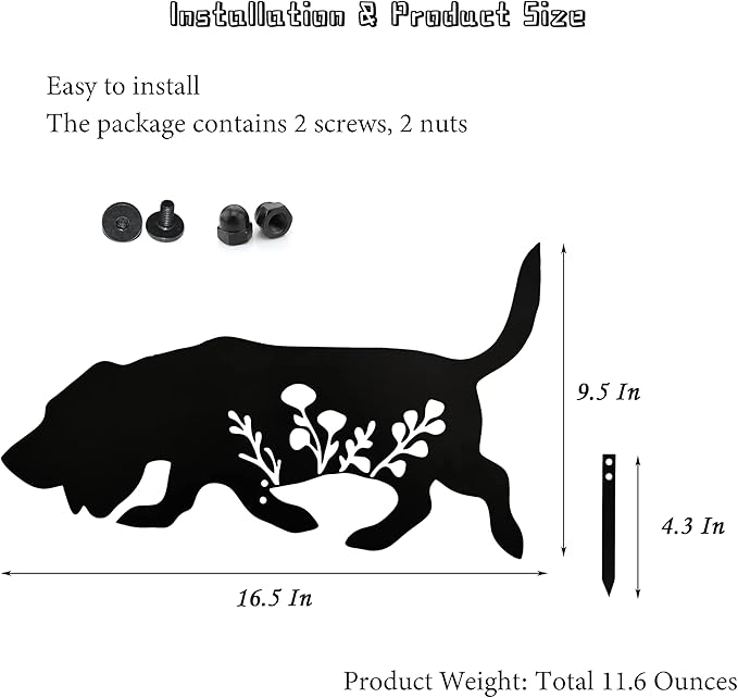 - 【EASY TO INSTALL】This metal dog decoration is designed with 2 holes for easy install. There are 2 expansion screws and nuts inside the package so you can easily connect the body part and stake.