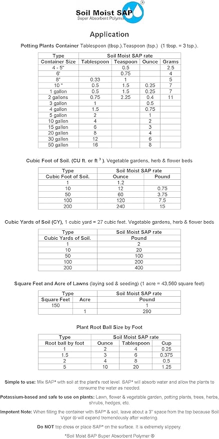 - Soil Moist SAP Super Absorbent Polymer is applied as a soil amendment for all plants.