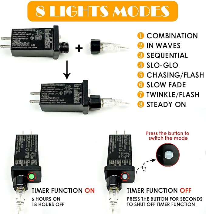 - Convenient Timer Function & 8 Modes & Memory Function: The button is at the end of the plug to turn on/off the timer function, press the button for few seconds till the green light on/off to turn on/off the timer function and switch 8 modes (combination, in waves, sequential, slo glo, chasing/flash, slow fade, twinkle/flash, steady on). This fairy lights could remember the setting of previous night you set.