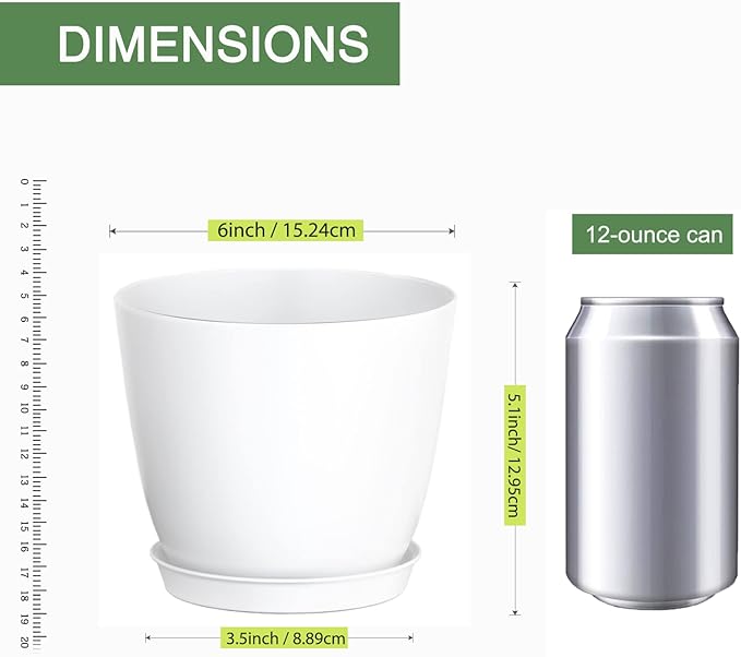 - [Excellent for Repotting Indoor Plants] 12 pack 6 inch plant pots with 12 pack plant labels and saucers are good for repotting plants and flowers which between 3''~5''. These pots are best to pour no more than 1/3 of the container's size in water. We suggested that Soil with 1 quart (1L) = 0.03 cu. ft. for 6 inch pot.