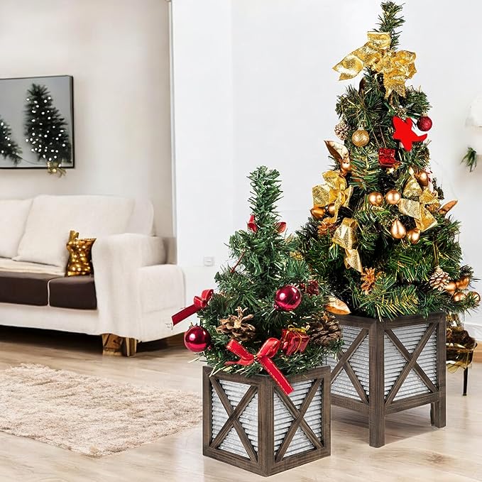 - Set of 2 Large Porch Planters - This set features two farmhouse-inspired planters, one with legs/stand and one without, offering versatility and visual intrigue. Crafted from durable corrugated metal, they effortlessly enhance your front porch with rustic elegance. Just pop your favorite flower pot inside and transform your space with an instant decor update!