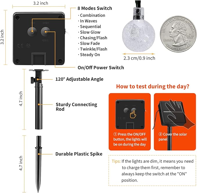 - 【Solar Powered & Auto On/Off】36ft 60 LED Halloween string lights, solar energy supply, adjustable monocrystalline silicon solar panel with better conversion rate of energy, no need to replace the battery or extra utility electric cost; Light sensor controls the solar globe lights auto on at dark and auto off at daytime.