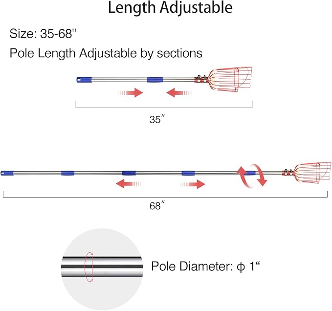 - ▼【Length Adjustable】Cherry picker tool length is adjustable by sections to be 35" to 68" which is safer and more efficient to get fruit from tall trees without falling off a ladder any more.