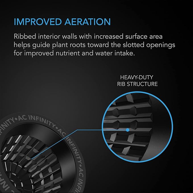 - Ribbed interior improves water and nutrient intake by guiding plant roots toward slotted openings.