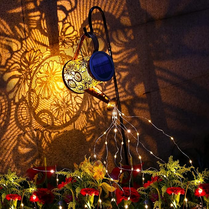 - Solar Watering Can With Lights -- VOOKRY Solar Garden Lights(with Shepherd Hook) comes with 5 LED String Lights (50 LEDs), The light wire is 3.28 feet long, which can be easily bent and shaped into any shape you like, perfect for DIY. Turn on the light at night and it will present a vivid and beautiful retro hollow pattern. Decorate your watering plants, vines, potted plants, porches, paths, patios and more, the perfect addition to your garden decor.