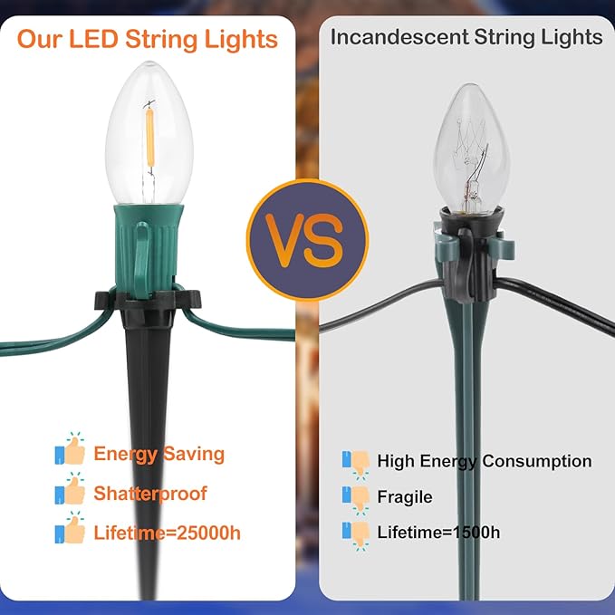 - Energy-Saving & Long-Lasting LED Bulbs: our C9 clear Christmas string lights are designed with advanced LED technology, which can provide you a bright and warm atmosphere while saving on energy and electricity bills. The LED Christmas decoration lights with stakes have a highly long-lasting lifetime up to 25000h, compared with incandescent lights with only works for 1500h, drastically reduce the frequency of bulb changes and effectively protect the environment.