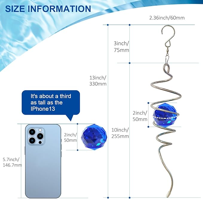 - 【 Meaningful Unique Gifts 】Sea Blue Crystal symbolizes hope and health. The Gazing Ball Spiral Tail Wind Spinner came in a beautiful gift box that was easily giftable. This magic ball spiral tail is a wonderful gift that will be a hit as a birthday gift, Thanksgiving gift, Christmas gift, housewarming gift, garden gift, Decor gift, etc.. The wind spiral with crystal ball is a perfect gift for birthdays, Thanksgiving Day, Christmas, etc. and any you loved people ( family, friend, etc.).