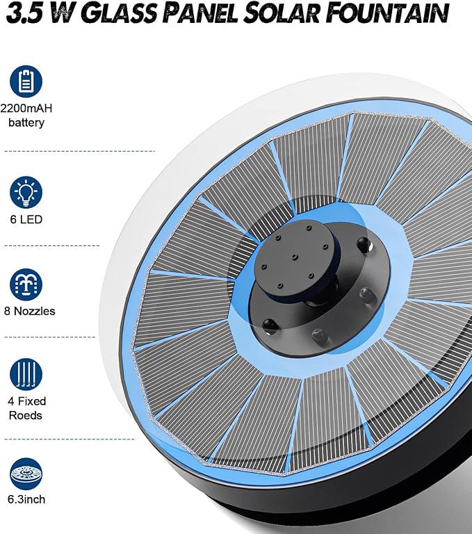- Anti- Drift Design: The package comes with a 6.3 inch solar fountain, 8 nozzles, 4 *5 fixed rods and 3 filter cotton; Do you worry about the solar fountain swing around the birdbath and spray outside? The fixed rods are better prevent the solar fountain from moving randomly; With 8 nozzles, you and your family can enjoy 8 fountain style; Solar bird bath fountains perfect for pond, pool, outdoor, patio, garden decoration, kids playing and animal drinking