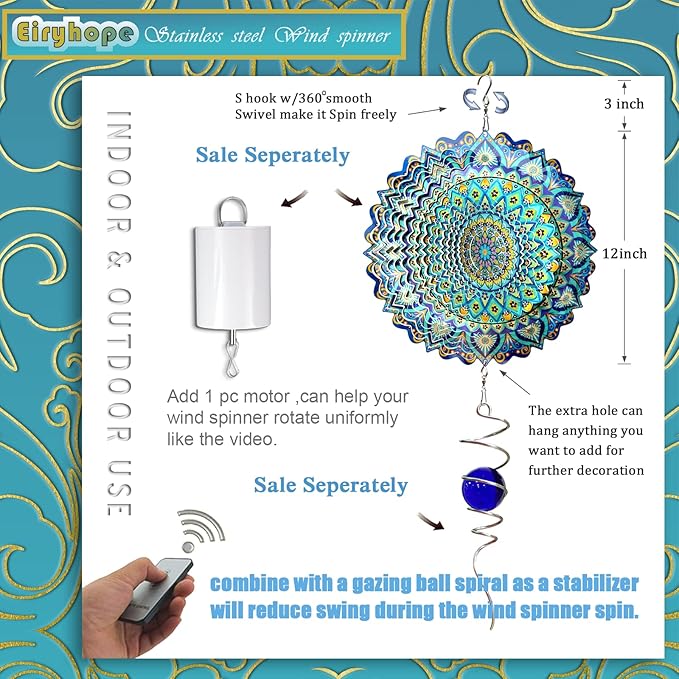 - 【 Premium Kinetic Wind Spinner Decor 】Our high quality wind spinner is a durable and artistic hanging decor. Made of stainless steel material, laser cut, hand polished and painted with epoxy protection, this stainless steel wind spinner is one of the best metal wind spinners, highly weather resistant, rust resistant and reflective. This quality outdoor décor has incredible color and light reflections that add color, movement and beauty to indoor and outdoor spaces.