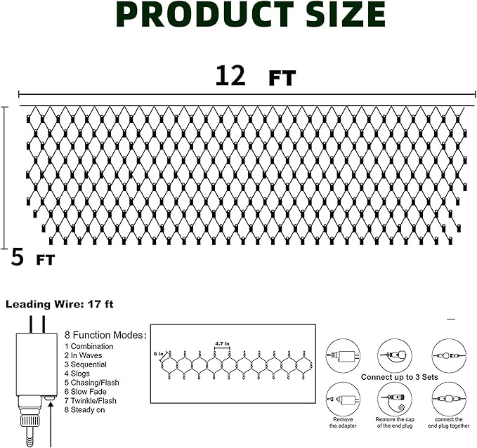 - Christmas Net Lights: Christmas 360 LED net lights, the size is 12 FT X 5 FT, the lead length is 16.5 FT, and the horizontal distance between each lamp bead is 4.7 inch. Place or hang the exquisite net lights on the trees, grass, bushes or any place you want, very easy to decorate.