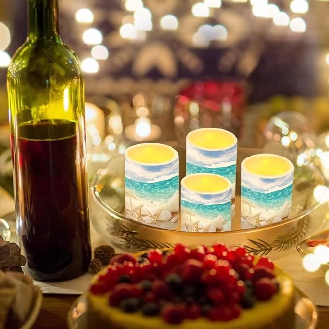 Beach Starfish Seashell Flameless Light Candles Battery Powered with Timer Remote Color Chaging Pillar Candle with Warm Yellow Color Changing Light Pack of 4