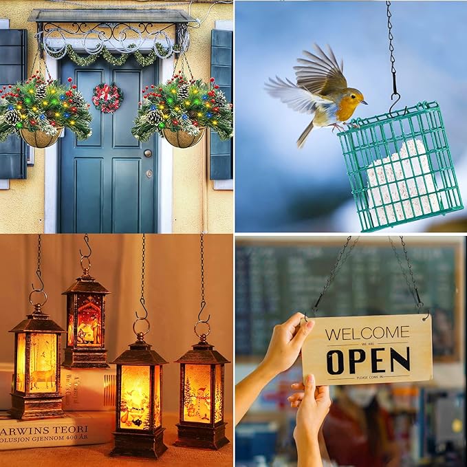 - Wide Application: Hanging basket chain with hooks endless uses. Decorate your outdoor and indoor, The black chain hooks for hanging plants、bird feeders、bird houses、plant baskets、flower pots, lanterns、wind chimes、christmas lights、christmas hanging basket、stained glass、ceiling、shooting targets、isle markers etc. Tips:Each of our chains has 2pcs S hooks, which make the suspension stronger and safer.