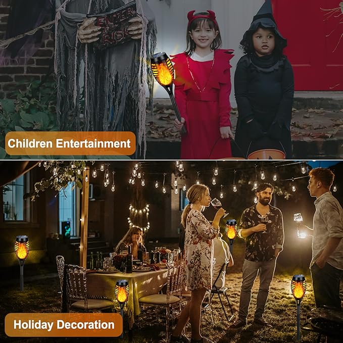 - 🎃【OCCASIONS WIDELY USED】The beating flame of the garden lights solar powered waterproof illuminates your house, garden, patio, yard, passage, driveway, etc. in the dark, so that the whole home is still bright and warm in the dark night; solar flame torch lights outdoor can be added to parties, camping, barbecues, weddings, etc. Bonfire atmosphere; can be used as a festive landscape decoration to provide the perfect romantic holiday atmosphere for your Halloween, Christmas, Valentine's Day, etc.