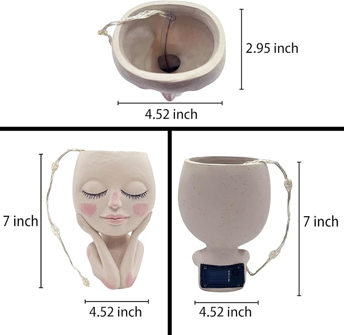 - đźăUnique DesignăSolar unique face planters maked with drainage holeďźWith 30 LED lights for DIY various shapes.Product length is 4.5 inches. The width is 3.5 inches. Solar light string in the flowerpot is protected by a casing, which is moisture-proof, sun-proof and IP65 waterproof, suitable for various planting. can withstand different weather conditions.