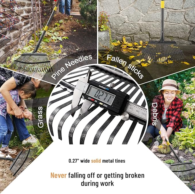 - Solid metal tine rake is able to clean not only leaves,grass,but also for fallen sticks,debris,etc
