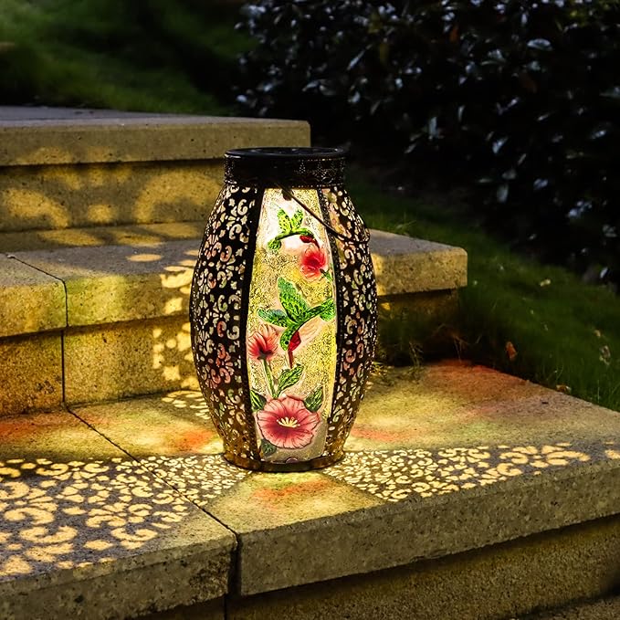 • 【Unique Glass Solar Lantern 】Hanging solar lantern feature a exquisite cardinal pattern, the vintage appearance will be unique addition for your garden or tabletop,and creating warm illuminated charm.