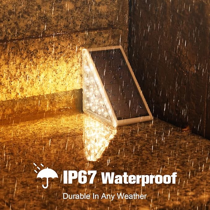 - 【Easy Installation】No wiring required, solar lights for steps are perfectly decored on garden stairs, patio, yard, deck, porch step and sidewalk,etc. The triangle solar outdoor lights go in the corners so they are not in the way. No worry about stepping and tripping. 2 installation ways: 1)Directly attached to the stairs by 3-M sticky tape. 2)Fix the outdoor accessories on the stair by screws and bolts. (Tips: Solar stair lights need to be installed in a sunny spot.)