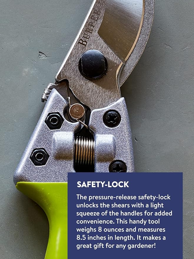 - SAFETY-LOCK: The pressure-release safety-lock unlocks the shears with a light squeeze of the handles for added convenience. This handy tool weighs 8 ounces and measures 8.5 inches in length. It makes a great gift for gardeners of all skill levels!
