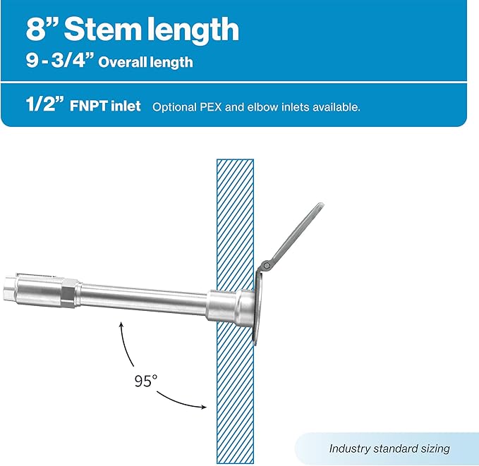- 8 inch stem: 9.75 inch total length, 1/2 inch NPT inlet x 3/4 inch GHT