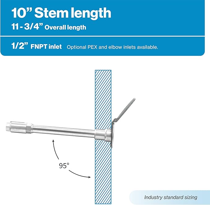 - 10 inch stem: 11.75 inch total length, 1/2 inch NPT inlet x 3/4 inch GHT