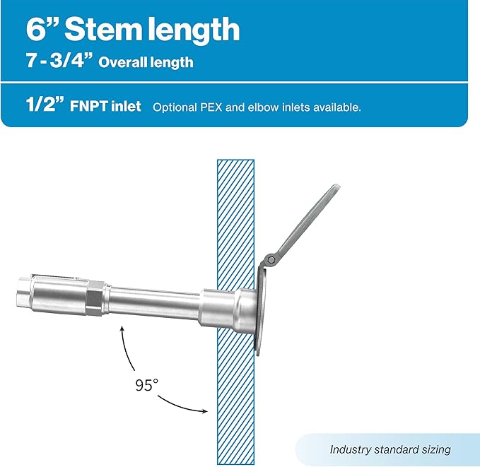 - 6 inch stem: 7.75 inch total length, 1/2 inch NPT (f) inlet x 3/4 inch GHT (m)