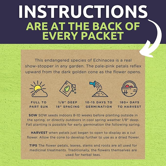 - 9 INDIVIDUAL SEED PACKETS: Borage, Chamomile, Tennessee Echinacea, Mix Nasturtium, Resina Calendula, Chives, English Lavender, Wild Arugula, Common Fenugreek.